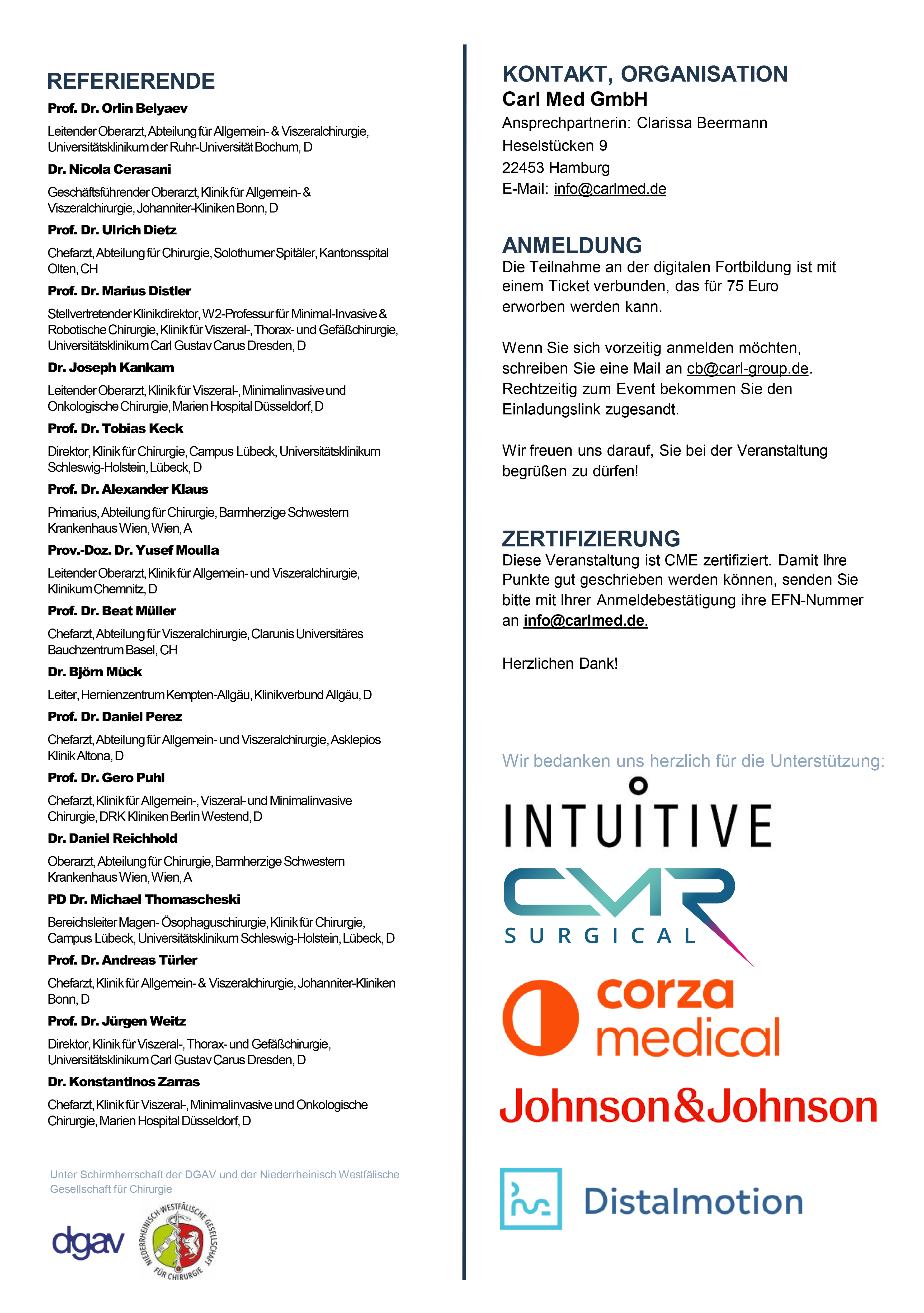 nach dem großen Erfolg der letzten Jahre freuen wir uns sehr, den RoboClub auch 2025 fortzuführen. Am 14. November 2025 laden wir Sie herzlich zum nächsten „RoboClub – Fokus Pankreas & Hernien“ ein. Die Veranstaltung wird vollständig digital umgesetzt und findet im Live-Stream aus fünf virtuellen OP-Sälen statt – mit Beiträgen aus insgesamt acht Kliniken. Inhaltlich widmen wir uns in diesem Jahr schwerpunktmäßig der kolorektalen Robotik, mit spannenden Live-OPs, interaktiven Formaten und Raum für den kollegialen Austausch – ganz bequem von Ihrem eigenen Bildschirm aus. Wir freuen uns auf Ihre digitale Teilnahme und einen spannenden Austausch mit Ihnen!